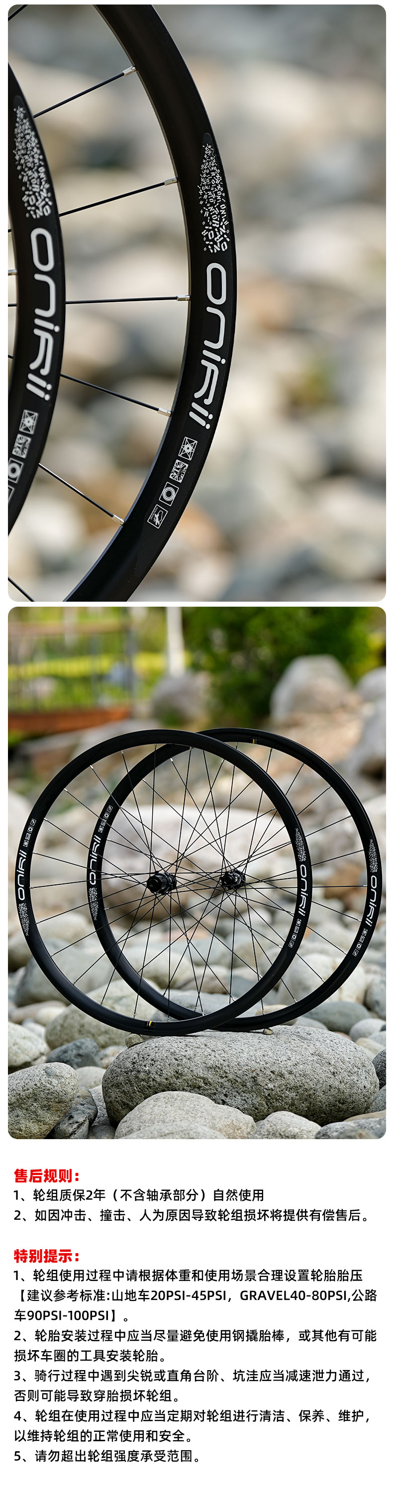 1、轮组使用过程中请根据体重和使用场景合理设置轮胎胎压