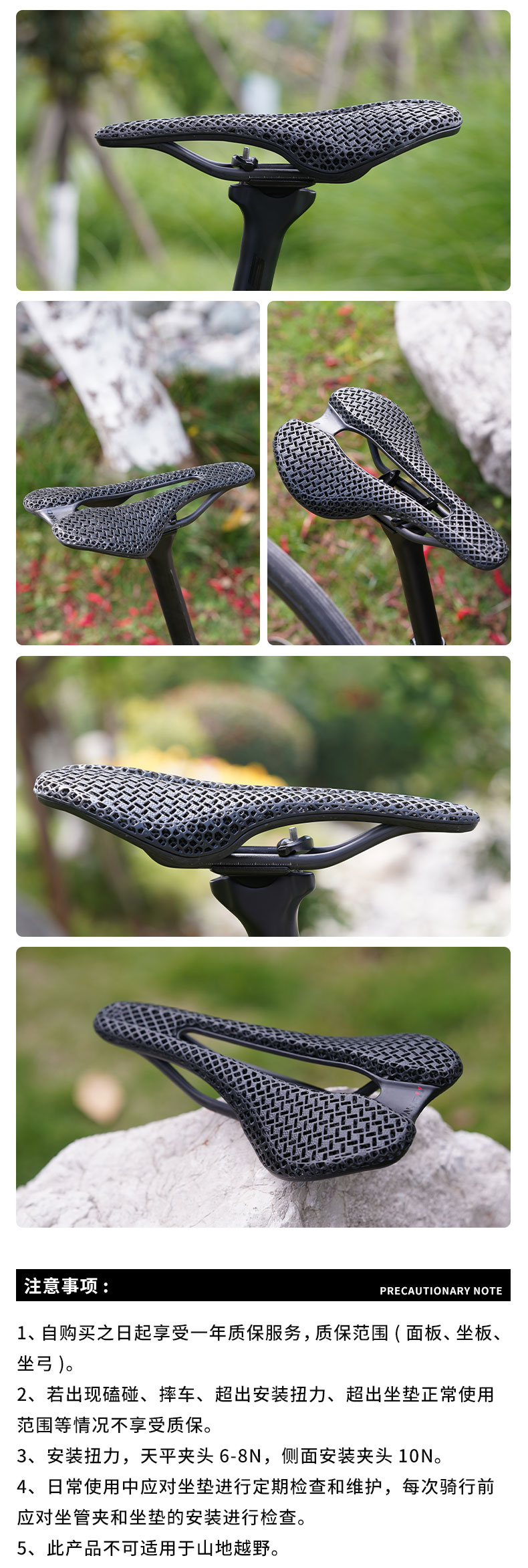 3、安装扭力,天平夹头 6-8N,侧面安装夹头 10N。4、日常使用中应对坐垫进行定期检查和维护,每次骑行前应对坐管夹和坐垫的安装进行检查。